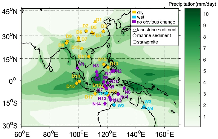 This theory also applies to the Younger Dryas (YD) event. Integrated records showed that the Asian-Australian monsoon region also generally presented an opposite hydrological spatial pattern, with the Asian monsoon region was dry and the Australian monsoon region was wet. This is corresponded to the southward shift of the “thermal equator” (and the ITCZ) induced by Northern Hemisphere cooling due to the weakening of the Atlantic Meridional Overturning Circulation (AMOC).